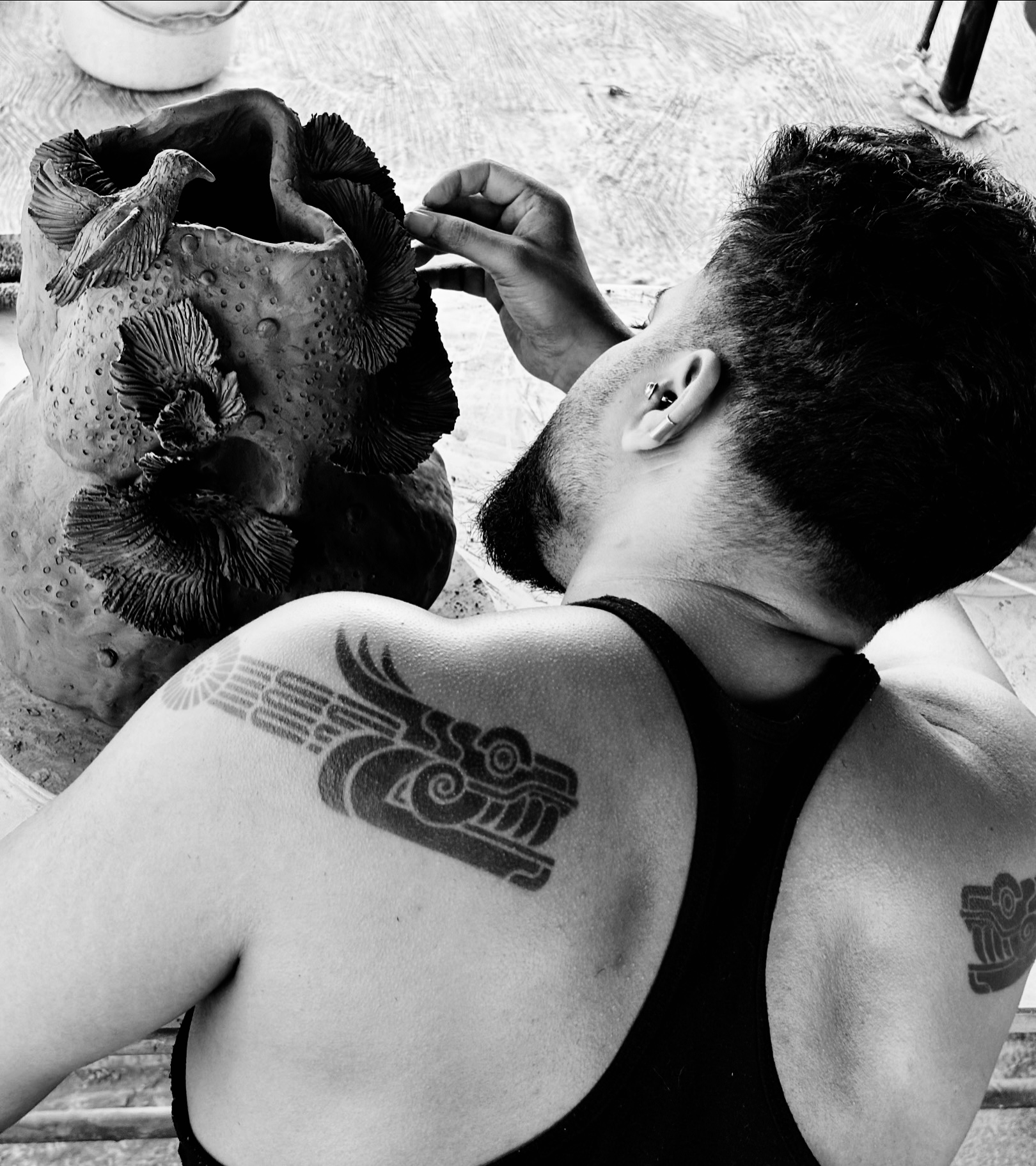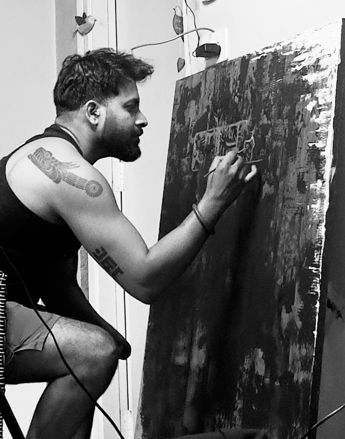 A graduate in Visual Design from NID Ahmedabad (2014), Rudraraj is also the founder of Rudranaad Foundation, a spiritual and charitable organization deeply rooted in India’s sacred traditions. As a teacher of Tantrism and the esoteric paths of yoga, his artistic expression reflects a mystical quest—a continuum between creation, contemplation, and transcendence. Rudraraj’s recent works explore non-objective interaction with abstract pictographs and glyphs, crafting a stunning visual experience through an intriguing amalgamation of media. Rediscovering the innocence of communication—like a child compelled to speak without the burden of meaning—his creations transcend conventional abstraction, becoming a spiritual gesture, a tactile meditation.